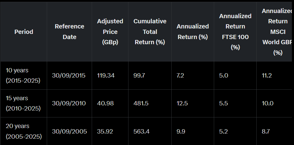 The long-term performance data for Legal & General tells a story of remarkable and consistent wealth creation, significantly outpacing its domestic benchmark. While the FTSE 100 has delivered respectable annualized returns between 5.0% and 5.5% across these periods, Legal & General has dramatically outperformed. Over the past 15 years, the company has achieved an exceptional annualized return of 12.5%, turning an investment into nearly six times its original value (a 481.5% total return). Even more impressive is its 20-year track record, generating a 9.9% annual return and a cumulative gain of over 560%. This demonstrates a powerful ability to compound growth over decades, firmly establishing it not just as a reliable income stock, but as a formidable engine for long-term capital appreciation.