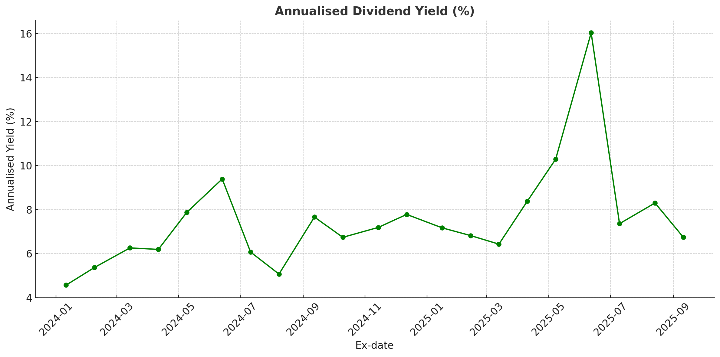 Taking the simple average of the monthly annualised yields since inception gives about 7.5%. This figure, however, should be read with caution: it does not represent the actual annualised yield of a buy-and-hold investor, but rather the average of the yield snapshots published each month. In practice, the true realised income depends on the cumulative cash distributions over time relative to the ETF’s price.