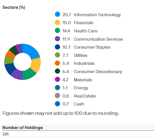 Therefore, the ETF’s main aim is to provide income, with capital appreciation as a secondary goal. It is actively managed and uses physical replication (it buys and holds stocks). The ETF holds equities directly, rather than more complex financial instruments.