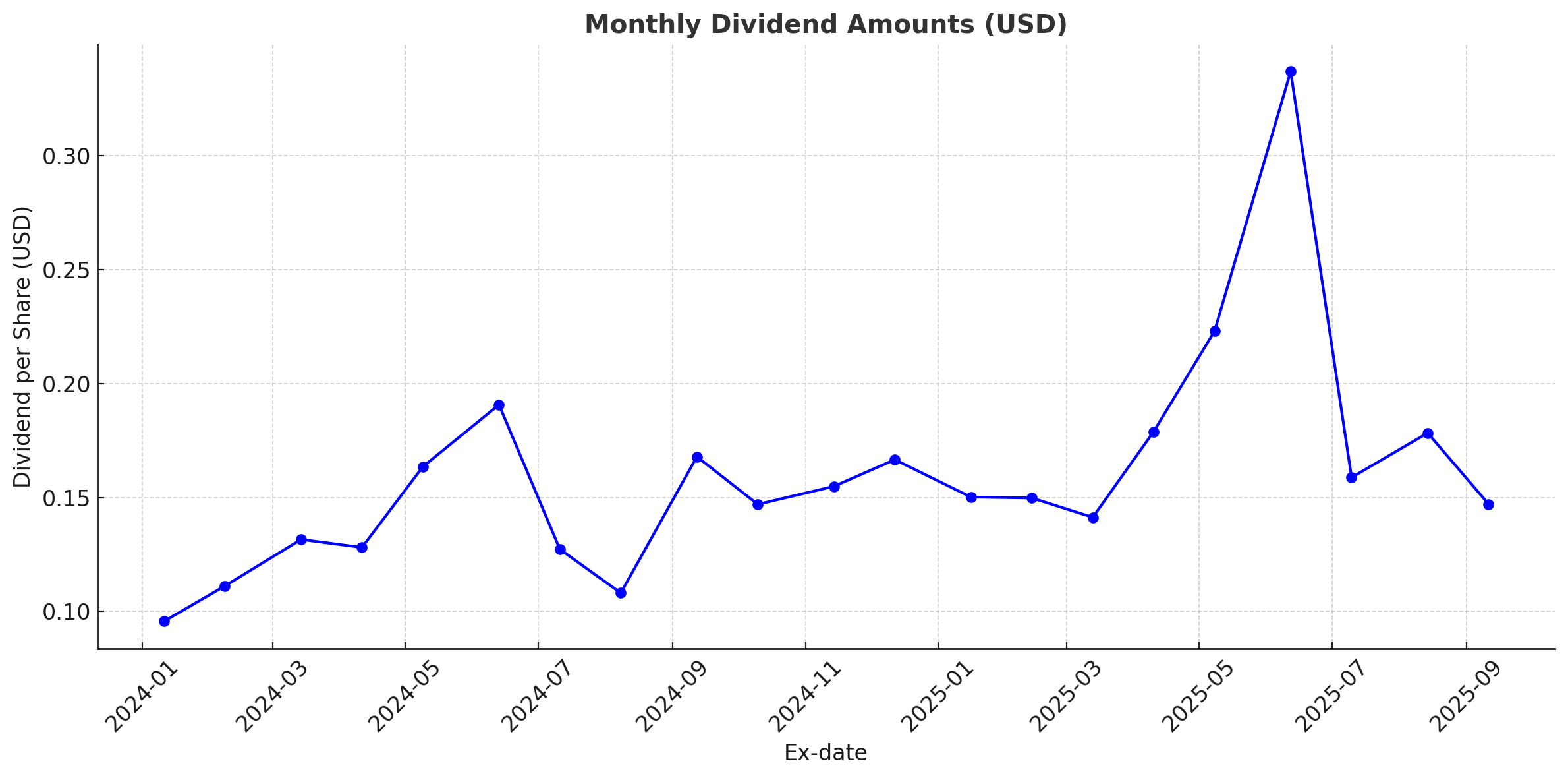Since its inception at a purchase price of $25.52, JEPG has offered investors a reliable stream of dividends with an effective annualized yield slightly below 8%. In 2024, distributions totaled $1.69 per share, corresponding to a 6.63% yield, while over the last twelve months (Sept 2024 – Sept 2025) payouts increased to $2.30 per share, or a 9.02% yield. Notably, the yield tends to rise during more turbulent market periods, as elevated volatility enhances the fund’s income generation. This counter-cyclical feature makes JEPG particularly attractive for investors seeking resilient cash flows in uncertain environments.