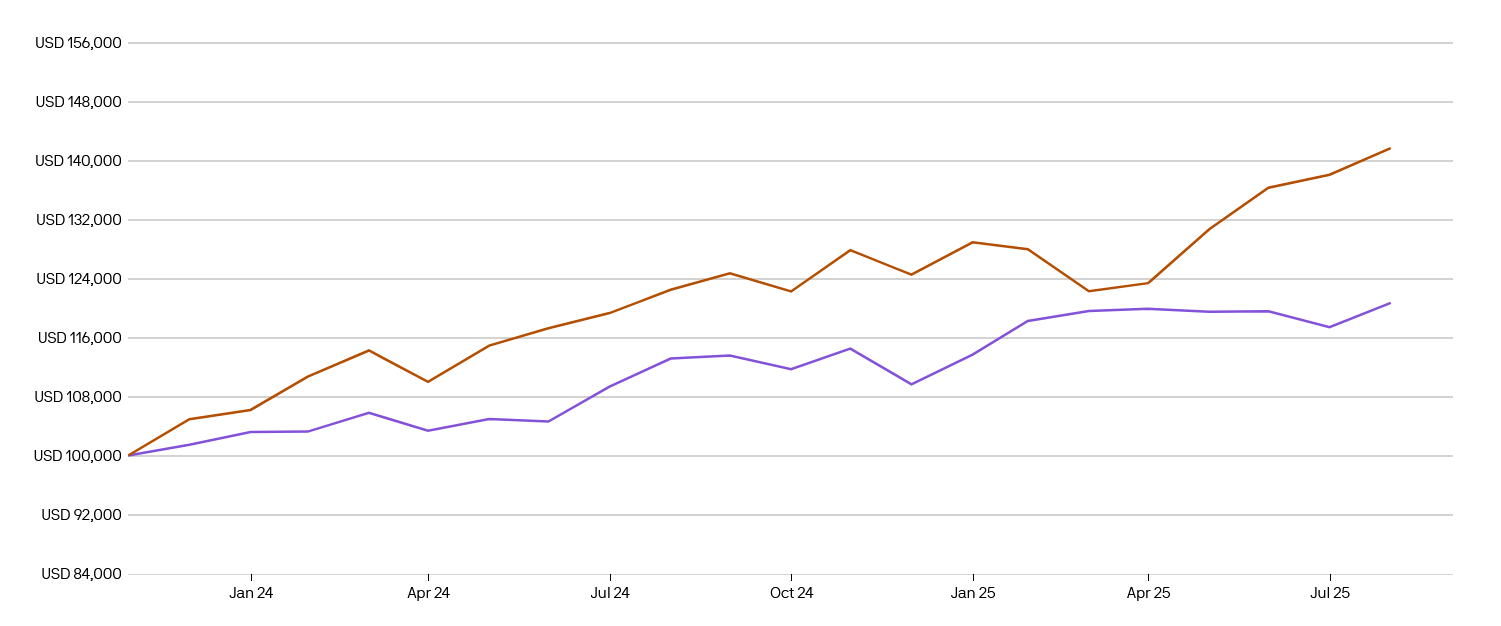 While JEPG has consistently paid out dividends on a monthly basis since launch, the distributions have been highly variable – ranging from below 5% to above 16% annualised – highlighting both the reliability of income and the inherent fluctuations of a covered call strategy.
