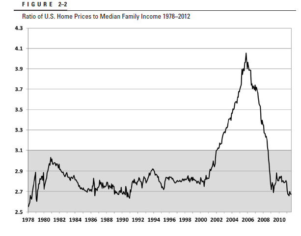 The author also traces the evolution of the markets by analyzing the major financial crises of 1929, 2001, and 2008. He recalls the role of the Fed (the US central bank) as a lender of last resort to limit the effects of the crisis: after letting Lehman Brothers fail, the insurer AIG was saved thanks to a massive loan. This crisis was caused by the explosion of the subprime bubble (toxic mortgage loans that had been widely disseminated into the global economy), triggering a real estate crisis, then a financial one, and finally, an economic one. The following chart (housing prices relative to median income) shows how inflated the housing bubble had become.