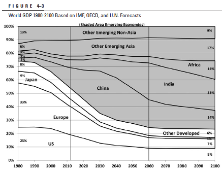 Two strategic issues are particularly highlighted by the author: the aging of the global population and the emergence of China, India, and Asia as a whole. He considers the question in these terms: will the young populations of developing countries be able to produce the goods for the aging populations of developed countries? And will these young people be rich enough to buy the assets of seniors in rich countries who will absolutely need to finance their retirements? The figure below indicates the potential shift in wealth production by the horizon of 2100, showing that the transfer of economic power will occur by the end of the century.