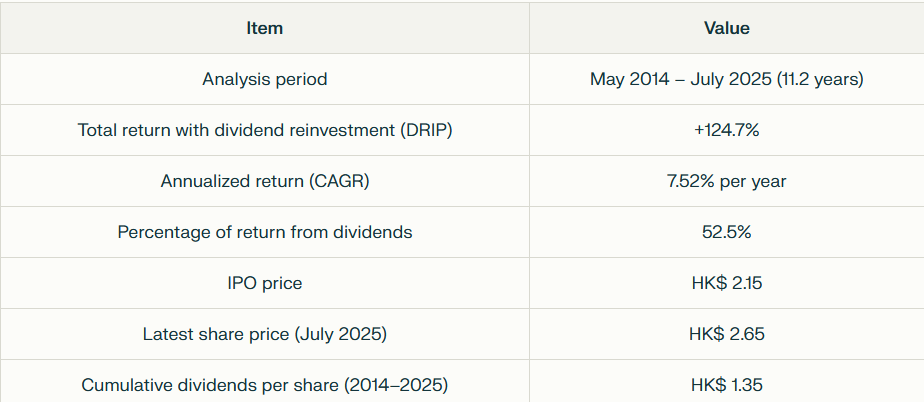 Between May 2014 and July 2025, Best Pacific (2111.HK) delivered a total return of +124.7% with dividends reinvested, resulting in a CAGR of 7.52%. Notably, 52.5% of this gain came directly from dividends. In comparison, the Hang Seng Index achieved a negative price return over the past decade, with a 10-year CAGR of approximately -0.28%. Even including dividends, total return for the Index remained flat to mildly positive—at best delivering a 0–1% annualized gain over the same period. This is a respectable performance and makes me think it’s a potentially interesting long-term investment, provided it is bought opportunistically and doesn’t occupy too large a share of the portfolio.