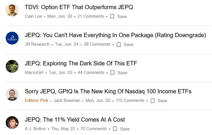 However, as the year progressed, doubts emerged. Analysts contended the strategy had structural weaknesses, questioning whether JEPQ could truly fulfill its long-term promises. The main critique centered on its “capped upside, uncapped downside” profile, which, combined with historically low volatility, made it unattractive both for growth seekers and income-focused investors. Critics also pointed to design flaws, especially since other covered-call ETFs sometimes delivered stronger returns. On Seeking Alpha, critical articles have surged recently (between May 22 and June 30, 2025), coinciding with the fund’s rising popularity.