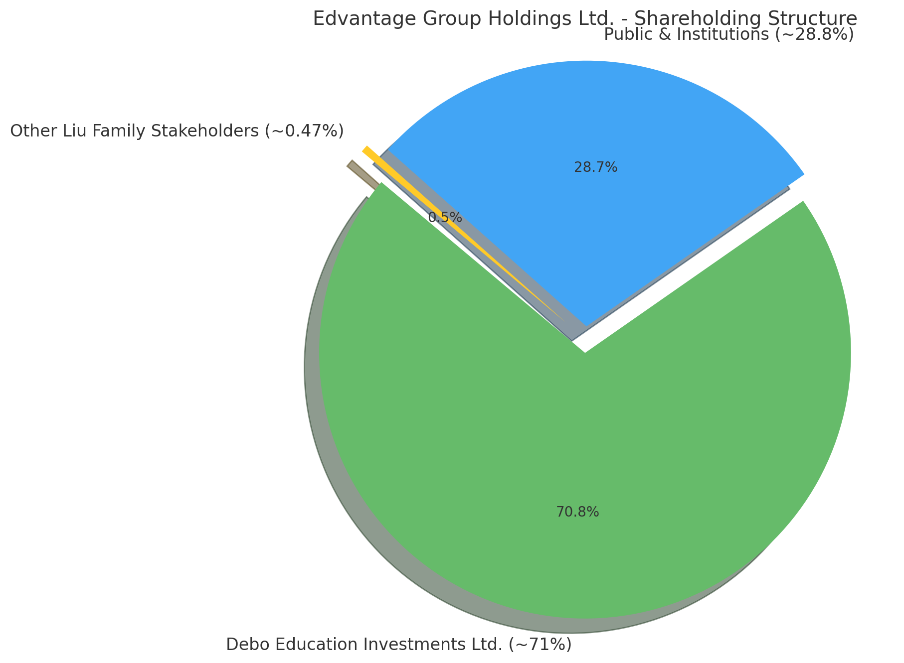 Not exactlyFirst, Edvantage Group’s shareholding structure is marked by a strong family presence, which can be a significant strength. Debo Education Investments Holdings Ltd., the majority shareholder with over 71% of the equity, is jointly owned by Mr. Liu Yung Chau and Mrs. Chen Yuan Rita, fostering a long-term vision and stable governance. This entrenched family ownership underscores a high level of commitment to the company’s success, aligning strategic decisions closely with shareholder interests. Meanwhile, the remaining shares are held by public investors and institutions, providing liquidity but still allowing the founding family to guide the company’s direction.