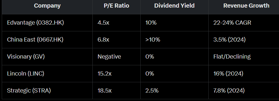 At 4.5x P/E and a 10% forward yield, Edvantage trades at crisis-level valuations — far below peers like China East Education (6.8x P/E), Lincoln (15.2x), or Strategic Education (18.5x). For income-focused investors, this mispricing could represent a rare asymmetric opportunity. Its 22-24% revenue CAGR (2016-2024) surpasses all peers, though regulatory risks in China and margin pressures warrant caution. Compared to stable U.S. peers, Edvantage’s high yield and growth potential make it attractive for income-focused investors willing to navigate its risks.