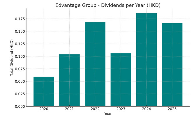 Since its IPO in July 2019, an investment of HKD 10,000 in Edvantage Group Holdings has generated a disappointing total return. The share price has fallen from HKD 2.85 at IPO to HKD 1.63 today, representing a loss of roughly 40% on the stock alone, while total dividends received over the period amount to approximately HKD 1,225. This brings the overall total return to around –30.5%. Such underwhelming performance underscores a well-known pattern: IPOs rarely reward early buyers with long-term gains, as initial hype often inflates prices beyond sustainable levels. However, with the stock now trading significantly below its IPO price, this could represent an attractive entry point for income-focused investors seeking stable dividends, provided they are willing to accept the inherent risks and uncertainty of a post-IPO recovery.