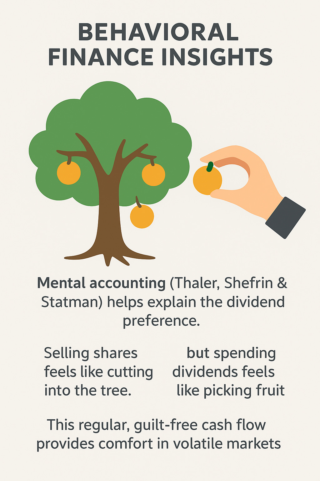 Mental accounting (Thaler, Shefrin & Statman) profoundly explains the dividend preference. Investors mentally separate capital (“the tree”) from income (“the fruit”). Selling shares feels like cutting into the tree, but spending dividends feels like picking fruit — preserving the asset while enjoying the harvest. This regular, guilt-free cash flow provides comfort in volatile markets, though it can tempt some into chasing unsustainably high yields.